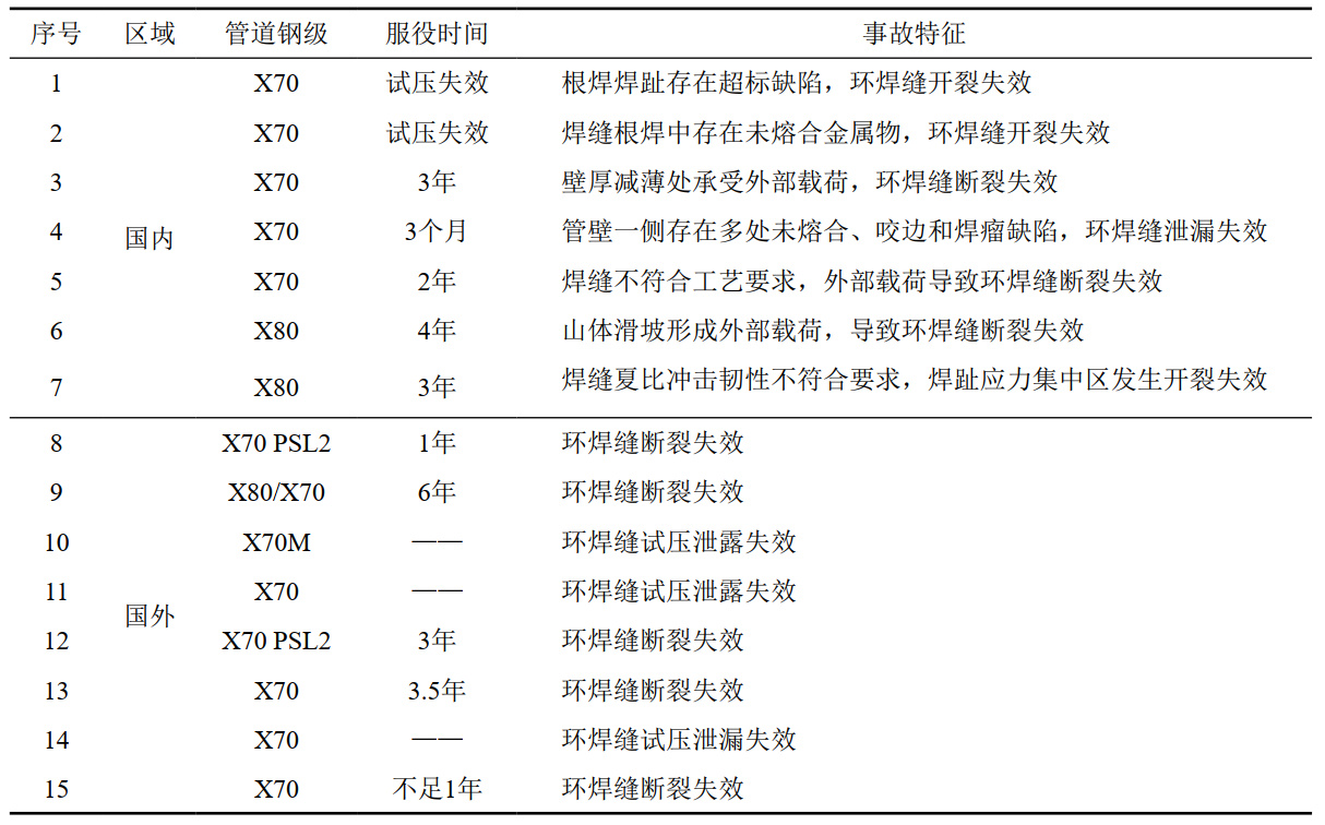 表 1 近年國內外高鋼級管道事故類(lèi)型及特征匯總