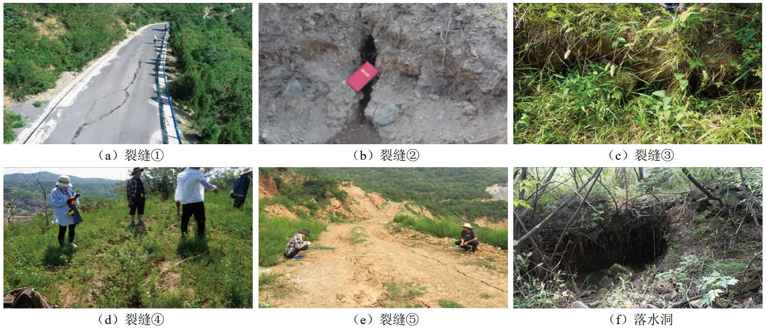 經(jīng)現場(chǎng)調查,滑坡體主要變形破壞特征為坡體出現如圖 3所示的裂縫及落水洞。在滑坡體上共發(fā)現5條裂縫,裂縫①位于后緣X040縣道路面上;裂縫②及裂縫③位于滑坡體南側坡體邊界上,均為縱向裂縫;裂縫④位于窯洞平臺土質(zhì)陡坎處,長(cháng)約30 m,寬度約10 cm~30 cm不等,可見(jiàn)深度約10 cm~30 cm;裂縫⑤位于坡體下部采坑人工堆渣邊坡頂部及道路上,長(cháng)約104 m,寬度2 cm~4 cm不等,深度約20 cm;滑坡體北側發(fā)現多處落水洞,直徑約0.2 cm~1.4 m,深約0.2 cm~1.7 m,裂縫及落水洞整體呈圈椅狀。根據現場(chǎng)調查及勘查成果分析,該滑坡處于緩慢變形階段,裂縫均由于滑坡變形引發(fā),其中裂縫①、裂縫④、裂縫⑤為拉張裂縫,裂縫②、裂縫③為剪切裂縫。