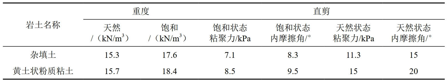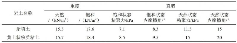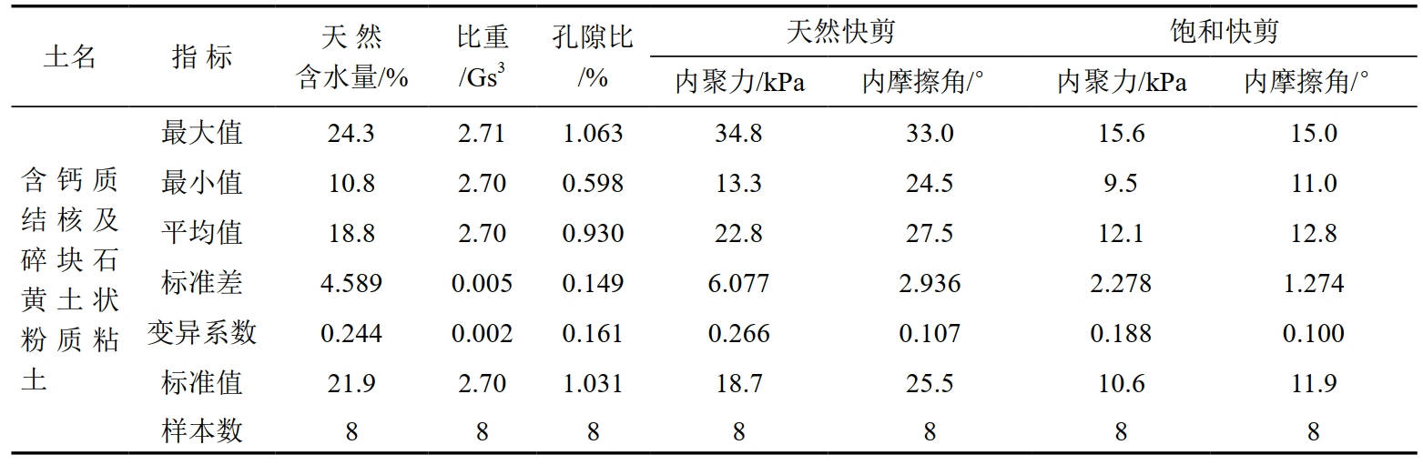 滑坡穩定性評價(jià)與計算中所采用的巖土物理力學(xué)參數的選取,是計算評價(jià)滑坡穩定性的關(guān)鍵所在。在滑體中采取土樣8件進(jìn)行室內試驗,結果統計見(jiàn)表 1。由于試驗土體中夾有大量鈣質(zhì)結核及碎塊石,而試驗時(shí)將其進(jìn)行剔除,導致試驗值產(chǎn)生一定偏差。因此根據現場(chǎng)勘查和室內土工實(shí)驗,坡體各地層的物理力學(xué)參數綜合取值如下表 2所示。