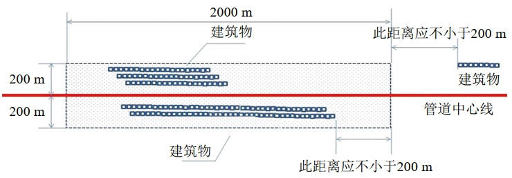 畫(huà)一個(gè)400 m×2000 m矩形框,在管道中心線(xiàn)沿軸向任意移動(dòng),矩形框的兩條400 m短邊距離框內外最近建筑物不應小于200 m,統計框內的住戶(hù)數量,兩端間管道則為高后果區,滿(mǎn)足規范規定的哪個(gè)條件就劃為哪個(gè)等級,簡(jiǎn)單易操作(圖 1)。