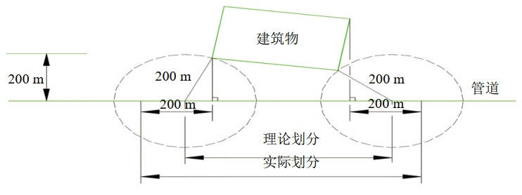 居民類(lèi)構建筑物具體確定高后果區邊界時(shí),按照規范要求,應在管道中心線(xiàn)上畫(huà)一個(gè)200 m半徑的圓,當圓弧與構建筑物相接時(shí),圓心距為高后果區的長(cháng)度,如圖 2中理論劃分。這樣的識別方法嚴謹,但實(shí)際操作難度很大,需將管道路由、構建筑物和兩者相對關(guān)系嚴格按比例繪圖,再用上述辦法畫(huà)圓,按比例推算圓心位置,確定高后果區長(cháng)度。在建設期識別時(shí)有圖紙可依托,基本可實(shí)現,但在運行期當構建筑物與原設計圖紙發(fā)生變化后,生產(chǎn)運行單位需要重新調繪管道周邊信息,按照比例繪制圖紙,精度要求高,難度大,不易實(shí)現。