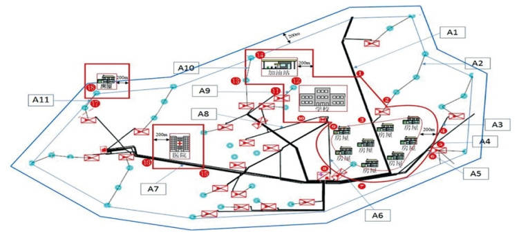油田集輸油管道大部分呈現為支狀、網(wǎng)狀結構,高后果區識別難度較大,通過(guò)實(shí)踐總結,形成了符合油氣田特點(diǎn)的區域識別法(圖 4)。根據管網(wǎng)年代、環(huán)境、介質(zhì)、管材等主要風(fēng)險因素,以平滑曲線(xiàn)連接邊界,將邊界線(xiàn)以平行趨勢向外延伸200 m,以延伸后的邊界線(xiàn)包含區域作為一個(gè)識別單位,統計管網(wǎng)單元內的特定場(chǎng)所、易燃易爆場(chǎng)所、人口密集區及該場(chǎng)所200 m范圍內包含的管道或管段,此管道或管段即為高后果區管道。