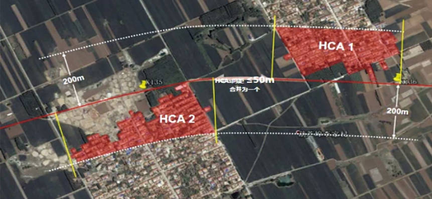 為了提高管理效率、降低管理難度和成本,將間隔小于50 m的同類(lèi)高后果區合并為一個(gè)高后果區管理(圖 5)。運行管理單位要采取管理措施或技術(shù)措施,減小高后果區管道泄漏的風(fēng)險,比如提高巡線(xiàn)頻次,加裝視頻監控設備等。