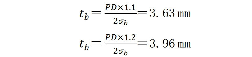 實(shí)際上,管道屈服以后管徑不斷增大。假設按管道10%和20%延伸率分別進(jìn)行計算,則管道爆裂的剩余壁厚分別為: