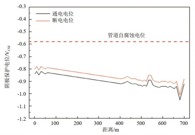 對事故點(diǎn)西側殘留管段以西700 m范圍內管地通電電位、斷電電位進(jìn)行測量,測試間距為10 m。測量結果表明該管段通電電位﹣0.83 VCSE~ ﹣1.05 VCSE,斷電電位﹣0.78 VCSE~﹣1.01 VCSE,如圖 4所示。此外,現場(chǎng)檢測該區域內未施加陰保管道及試片的自然電位為﹣0.48 VCSE~﹣0.63 VCSE。