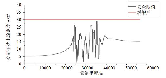 經(jīng)多次模擬計算,采取“鋅帶+固態(tài)去耦合器”交流干擾緩解措施,交叉伴行管段增設9處鋅帶,排流點(diǎn)位置選取與伴行段接近和遠離位置,如圖 3所示。計算結果表明:在采取緩解措施后,管道交流干擾電壓有效降低,預測管道交叉伴行段交流干擾電流密度小于 30 A/m2,滿(mǎn)足可接受準則要求,如圖 4所示。