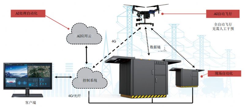任務(wù)管理:在客戶(hù)端發(fā)布巡線(xiàn)任務(wù),無(wú)人機接收到4G信號指示后沿著(zhù)設定的航線(xiàn)起飛、巡檢,到達50 km圖傳距離后進(jìn)入無(wú)人機停機坪充電,信號轉接。