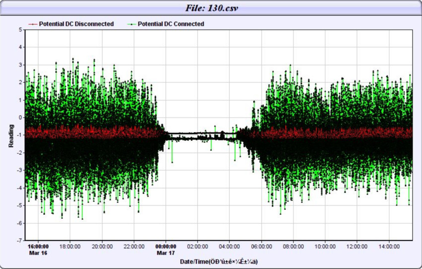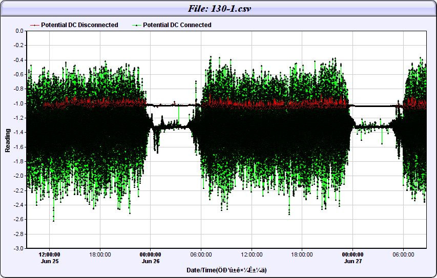 排流施工結束后,依舊采用UDL-2對管道長(cháng)時(shí)間通/斷電位進(jìn)行監測,以此判斷排流地床有效性有了明顯改善(圖 3)。安裝排流地床后,3處測試樁斷電電位曲線(xiàn)明顯下移,電位正于﹣850 mV的電位占比低于5%,說(shuō)明排流地床設計、施工達到預計要求。