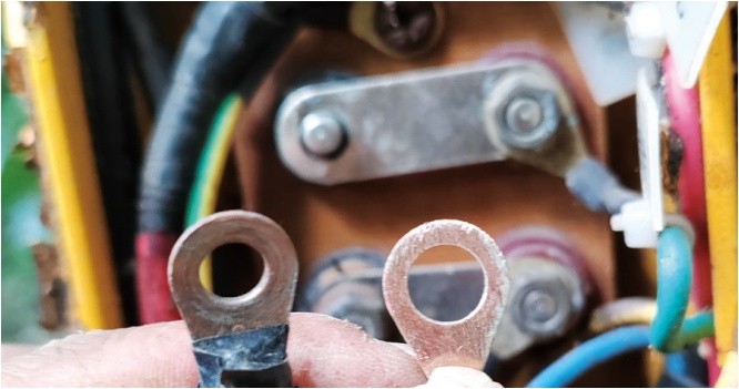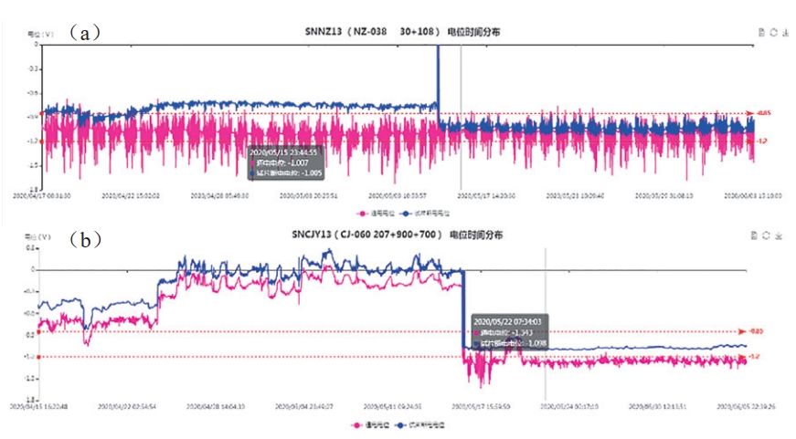 樁內連接線(xiàn)常見(jiàn)故障有接線(xiàn)頭銹蝕、測試線(xiàn)損壞以及接線(xiàn)問(wèn)題。日常管理中需要定期給接線(xiàn)柱和線(xiàn)頭進(jìn)行打磨處理,以確保接觸良好(圖 1)。事實(shí)證明,試片接線(xiàn)和參比接線(xiàn)的良好接觸以及是否松動(dòng)都會(huì )對設備檢測結果造成影響。圖 2 a為試片接線(xiàn)端打磨處理前后通斷電電位變化情況,圖 2 b為參比線(xiàn)重新連接前后通斷電電位變化情況。試片接線(xiàn)和參比接線(xiàn)失效,其后果等同于試片和參比失效(藍色線(xiàn)條為斷電電位,紅色線(xiàn)條為通電電位,下同)。