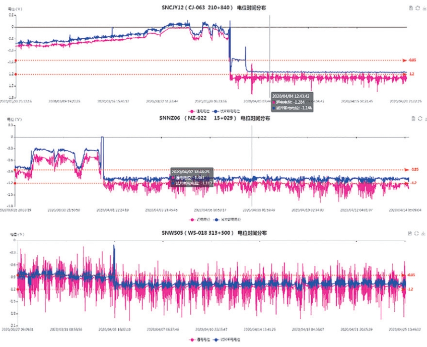 鋼制埋地輸油管道智能測試樁為管道保護提供了數據基礎,但測試樁故障會(huì )造成陰保數據不準確,F場(chǎng)實(shí)踐證明,不同部件的失效在電位曲線(xiàn)圖上會(huì )呈現不同的變化規律。做好智能測試樁樁體、智能采集儀、電源、參比電極、試片等零部件的故障排查與維護,對保證電位數據的真實(shí)性具有重要的意義。