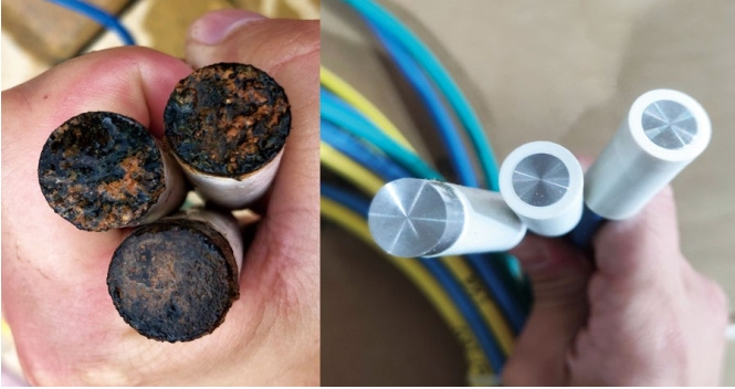 (2)試片的檢測方法。為了消除IR降,以更準確地檢測出斷電電位,試片通常埋設在管道附近。SN管道上用于檢測直流斷電電位的試片面積為6.5 cm2。雖然試片與管道連接并受陰極保護,但由于長(cháng)期埋設在地下,特別是在南方地區水位較高且長(cháng)時(shí)間泡在水中,會(huì )導致附著(zhù)物或沉淀物的形成,如圖 5所示。此外,地下水位的上升或者下降也可能導致試片與土壤之間出現間隙,從而影響斷電電位的準確性。