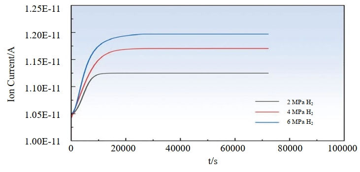 采用氫含量測試儀HTDS-003對X52管線(xiàn)鋼的氫含量進(jìn)行測定。將X52鋼切割成尺寸為20 mm×10 mm×3 mm的塊狀試樣,使用SiC砂紙打磨至2500#,進(jìn)行機械和電解拋光,去除表面殘余應力,記錄試樣重量。分別在氫氣壓力為2 MPa、4 MPa、6 MPa的條件下對試樣進(jìn)行預充氫,充氫時(shí)間為24 h。提前對測試儀器進(jìn)行氫氣標定,以便于充氫完成后將試樣在1 min內裝入設備并進(jìn)行測定。測定溫度范圍為室溫至800℃,升溫速率為100℃/h。