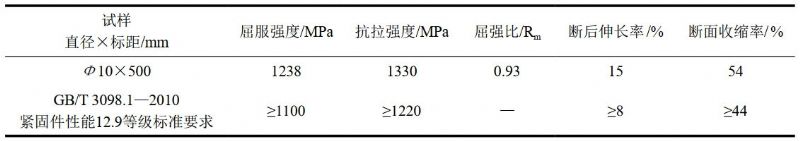 拉伸試驗。在螺栓桿體上沿縱向取圓棒狀試樣進(jìn)行拉伸性能試驗,試樣標距段直徑為10 mm,標距段長(cháng)度為50 mm。試驗在UTM5305材料試驗機上進(jìn)行,執行GB/T 228.1―2021《金屬材料 拉伸試驗 第1部分:室溫試驗方法》,參照GB/T 3098.1—2010進(jìn)行結果比對,符合標準中12.9緊固件性能等級要求(表 2)。