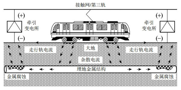 直流干擾源主要包括直流電氣化鐵路、城市軌道交通(地鐵)、直流輸電線(xiàn)路接地極、直流電網(wǎng)及其他構筑物陰極保護系統等。其中,地鐵干擾是最具代表性的動(dòng)態(tài)直流干擾類(lèi)型。地鐵供電系統主要由直流牽引變電站、饋電線(xiàn)、接觸網(wǎng)、列車(chē)、走行軌、回流線(xiàn)六部分組成。直流牽引變電站將外接交流電源降壓整流為直流電流,通過(guò)饋電線(xiàn)、接觸網(wǎng)給地鐵列車(chē)供電,并由走行軌和回流線(xiàn)牽引電流回流。其中,直流牽引系統回流電流的泄漏是對埋地油氣管道形成雜散電流干擾的主要原因;亓麟娏鲝淖咝熊壟c道床之間絕緣性能較差的部位泄漏進(jìn)入大地,流入大地的一部分電流會(huì )進(jìn)入附近防腐層較差的埋地管道,通過(guò)管道這一低電阻通道向遠處傳播,并在遠端防腐層破損部位流出管道,經(jīng)土壤回流至牽引變電站(圖 1)。雜散電流的流入點(diǎn)為陰極區,管地電位負向偏移,管道本體存在氫脆及防腐層剝離風(fēng)險;雜散電流流出點(diǎn)為陽(yáng)極區,管道本體存在加劇腐蝕風(fēng)險。