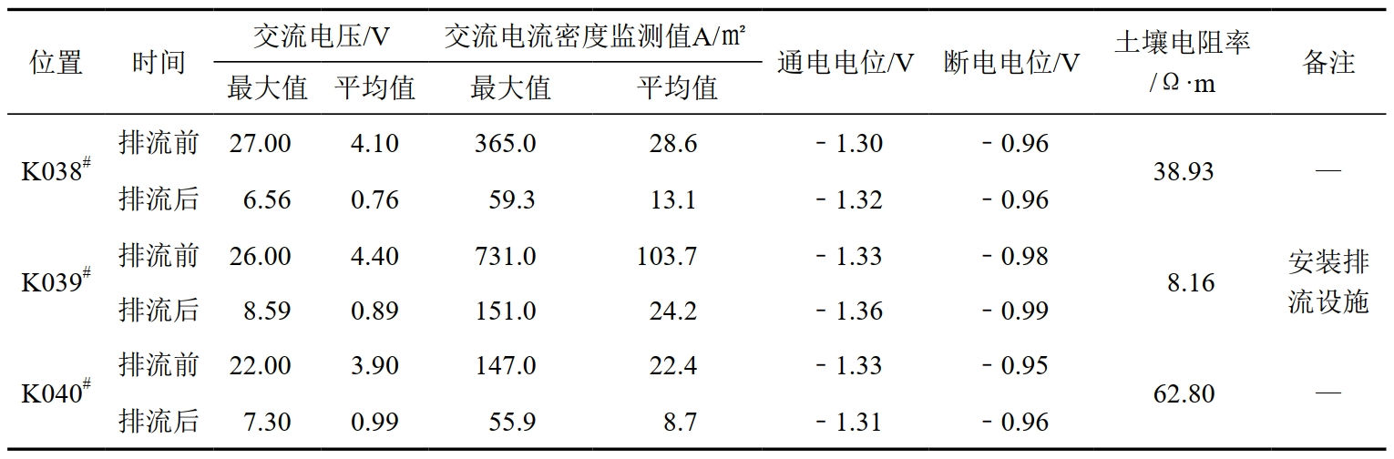 檢測評價(jià)排流后效果,包括設施檢查、接地極接地電阻測試、接地極電位測試、排流量測試等。通過(guò)檢測數據分析(表 2),管道K039#測試樁處安裝排流設施后,交流電壓平均值由4.4 V降至0.89 V,交流電流密度平均值由103.7 A/m²降至24.2 A/m²。K038#—K040#管段的交流電流密度平均值均小于30 A/m²,其余臨近管道位置的交流電壓及交流電流密度均達到排流防護效果;地床電阻0.88Ω,小于4 Ω,交流排流量在476 mA~578 mA,排流地床開(kāi)/閉合電位無(wú)變化;管道排流器安裝前后,所涉及管段的斷電電位均在﹣0.95 V~﹣0.99 V,陰保正常。