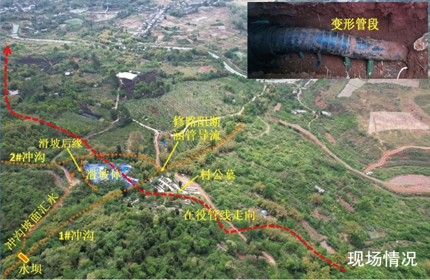 某成品油管線(xiàn)敷設于城市邊緣,擔負著(zhù)機場(chǎng)供油保障。在設計勘察階段,因無(wú)其他路由而選擇了管道橫坡敷設通過(guò)古滑坡地段的方案。施工階段采用大開(kāi)挖方式穿越1#、2#沖溝,并做了護底、護岸水工保護。管道建成后村委會(huì )在管道上游山坡上修建了公墓,同時(shí)還修建了機耕道,種植了大片果樹(shù),并將1#沖溝分兩級阻斷,筑壩蓄水。