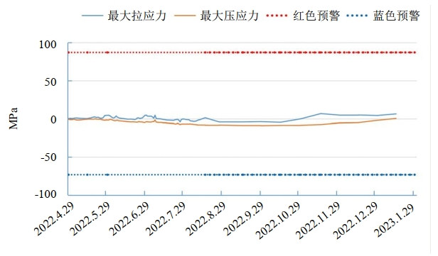 根據公式計算各監測截面監測拉、壓應力閾值如表 1所示,采用安裝時(shí)溫度17.25℃,正負溫差變化為±27.3℃:計算出監測拉應力閾值和壓應力閾值分別為290.2 MPa、﹣244.3 MPa。