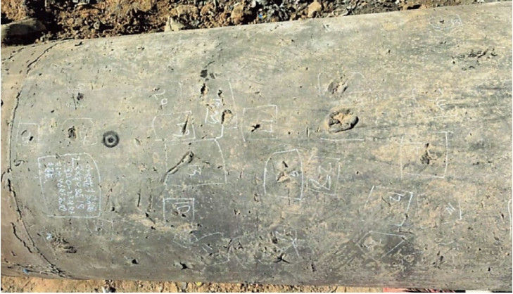 防腐層破損點(diǎn)檢測。對裸露段下游15m管道進(jìn)行了開(kāi)挖暴露,采用10 kV脈沖電火花檢漏儀對管道裸露部分進(jìn)行漏點(diǎn)檢測,檢測長(cháng)度共計36 m。經(jīng)檢測發(fā)現480余處防腐層破損,主要位于管道9點(diǎn)、0點(diǎn)、3點(diǎn)時(shí)鐘區域(圖 2),管道底部防腐層無(wú)明顯破損,說(shuō)明其損壞原因由水毀所致。其中21 m裸露段管道防腐層已基本失效,新開(kāi)挖段管道防腐層存在部分破損。