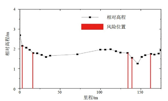 對該集輸管線(xiàn)的10個(gè)管道進(jìn)行高程測試,測試的總長(cháng)度為6.414 km;诠芫(xiàn)的高程測試數據,根據式(1)和式(2)計算求得管線(xiàn)實(shí)際坡度隨里程的變化(圖 1)。其中,管線(xiàn)穿越水域部分的相對高程用虛線(xiàn)表示。