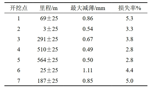 對剩下6個(gè)開(kāi)挖點(diǎn)進(jìn)行開(kāi)挖和檢測,最終7個(gè)詳細檢查位置的最大壁厚減薄數據(表 2)。6處壁厚減薄不大于5%,僅有1處位置發(fā)現內腐蝕引起壁厚損失超過(guò)了5%,最大缺陷位于1號開(kāi)挖點(diǎn),壁厚損失為5.32%。結果表明,內腐蝕缺陷發(fā)展不顯著(zhù),驗證了預測結果的準確性。
