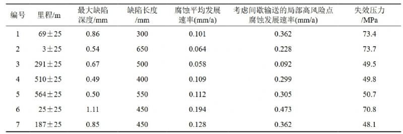 基于4.1小節得到的管道腐蝕發(fā)展速率和管道失效壓力,可以計算出各條管線(xiàn)在考慮間歇輸送的局部高風(fēng)險點(diǎn)腐蝕發(fā)展速率情況下的剩余壽命。結果表明,7條目標管線(xiàn)的剩余壽命均為20年。