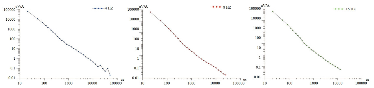發(fā)射頻率。會(huì )影響探測深度,頻率越低,探測深度越深。4 Hz、8 Hz和16 Hz的響應曲線(xiàn)(圖 3)中可以看到,4 Hz衰減曲線(xiàn)由于采樣周期較長(cháng),造成晚期出現隨機干擾,有效采樣道數變少,證明其頻率不適合本測區的電性反應條件;8 Hz的衰減曲線(xiàn)比較圓滑,較晚的信號出現的波動(dòng)干擾也較小,證明有效信號的總體衰減趨勢特征已經(jīng)被完整采集;16 Hz的衰減曲線(xiàn)更為圓滑,但其衰減曲線(xiàn)的采樣道數只有25道,總采樣道數比8 Hz頻率少3道,證明這個(gè)頻率的采樣周期完成后,有效衰減信號仍然還在延續,說(shuō)明只能采集到衰減信號的前部和中部,較晚的信號無(wú)法獲得,因此會(huì )丟失較深的地層信息。因此,確定選用既能夠將有效的衰減信號采集完整,并且能夠保持較多的采樣道數的8 Hz進(jìn)行數據采集。