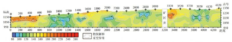 綜合已有地質(zhì)資料與物性資料對每條測線(xiàn)進(jìn)行數據處理和解釋?zhuān)F以L(fǎng)120測線(xiàn)為例進(jìn)行解釋說(shuō)明。L120測線(xiàn)瞬變電磁反演結果(圖 4)中,該測線(xiàn)探測范圍內地下存在7處異常區。其中點(diǎn)號0 m~540 m發(fā)現相對高阻反應,根據異常所在標高1050 m~1100 m處,結合資料分析推斷為新田煤礦5-1煤層采空,致使該處電阻率偏高于周?chē)鷰r性;在點(diǎn)號3260 m~3380 m發(fā)現相對高阻反應,根據異常所在標高1200 m~1250 m處,結合資料推斷為西岔溝煤礦3-1煤層采空,致使該處電阻率偏高于周?chē)鷰r性;在點(diǎn)號800 m~1240 m、1400 m~1560 m、1960 m~2100 m發(fā)現相對低阻反應,根據異常所在標高1050 m~1100 m處,結合資料分析推斷為新田煤礦5-1煤層圍巖富水或采空區局部含水引起;在點(diǎn)號2620 m~2860 m和3740 m~4100 m發(fā)現相對低阻反應,根據異常所在標高1150 m~1250 m處,結合資料推斷為西岔溝煤礦3-1煤層采空充水或泥質(zhì)充填后所引起。