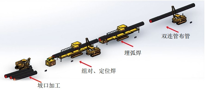通過(guò)上管平臺將一組(兩根)防腐管先后傳送至定位焊位置進(jìn)行組對、預熱和定位焊,再通過(guò)自行走式大口徑雙連管預制裝備(圖 1)的滾輪傳送至內外埋弧焊工位,進(jìn)行內部埋弧焊接,內焊接完成半個(gè)圓周后開(kāi)始進(jìn)行外部焊接,此時(shí)鋼管連續轉動(dòng),直至完成整個(gè)環(huán)焊縫內外埋弧焊接。焊接好的雙連管通過(guò)下管平臺傳送至端部的檢測區進(jìn)行無(wú)損檢測和機械化防腐補口,合格的管段預存至成品堆放區或由專(zhuān)用運管車(chē)運至施工現場(chǎng),按照單管組焊方式進(jìn)行后續施工(圖 2)。