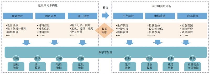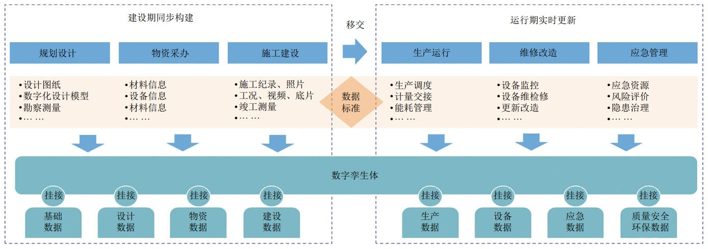 基于項目經(jīng)驗積累,形成竣工資料數據標準,通過(guò)對建設期各業(yè)務(wù)階段產(chǎn)生的圖紙、文件、施工記錄、三維模型、照片、模型等進(jìn)行數字化采集,構建數字孿生體,數據全面關(guān)聯(lián)掛接,并與實(shí)體工程同步產(chǎn)生,實(shí)現建設期數據以數字化的方式向運營(yíng)期同步移交(圖 4)。