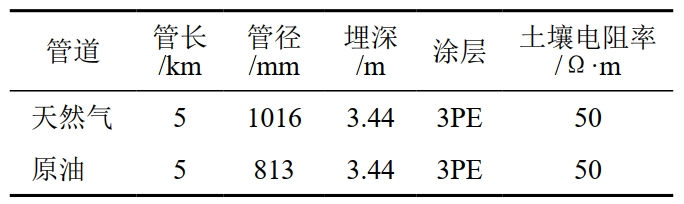 管道間距、土壤電阻率、涂層破損率等因素對管道陰極保護的干擾具有重要影響,因此將采用上述數值模擬方法研究各因素對陰極保護的影響規律。原油管道和天然氣管道并行鋪設,管徑、埋深、土壤電阻率等參數(表 1)采用現場(chǎng)參數,實(shí)際測試干擾距離不足3 km。
