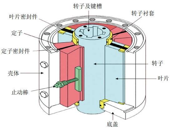 Shafer氣液聯(lián)動(dòng)執行機構的擺缸主要由轉子、葉片、葉片密封件、轉子襯套、定子、定子密封件、止動(dòng)棒、殼體、底蓋等組成(圖 1)。
