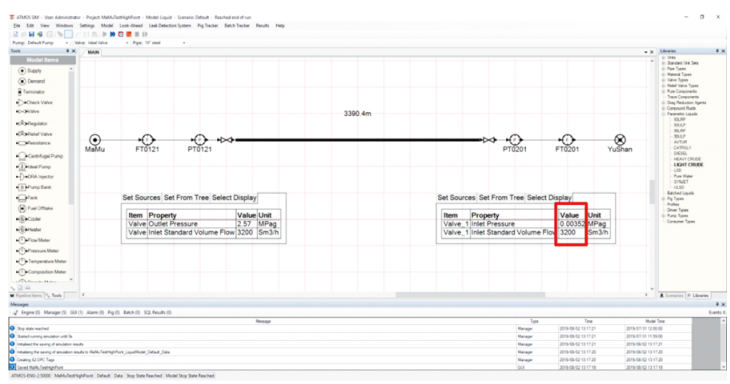 為了進(jìn)一步驗證輸油管道當前的運行狀態(tài),使用模擬仿真系統建立了原油管道的模型(圖 9)并進(jìn)行相關(guān)的分析,根據當前輸油管道的工況,設定輸量為 3200 m³/h,馬目首站出站壓力為2.57 MPa,如果是正常原油滿(mǎn)管輸送操作模式下,計算出魚(yú)山末站進(jìn)站壓力應該保持在1.97 MPa。