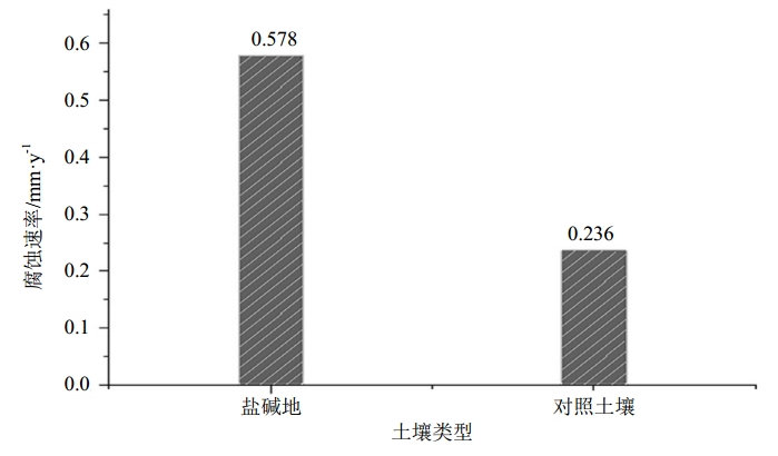 (1)鹽堿地土壤中金屬基體減薄較為明顯,其腐蝕速率達到非鹽堿地對照土樣的2.4倍。ER腐蝕速率探頭監測的腐蝕速率與實(shí)驗室試片腐蝕速率接近,腐蝕速率顯著(zhù)超出標準規定的自腐蝕速率臨界值0.3 mm/y,實(shí)測數據高達0.688 mm/y,超標229%。