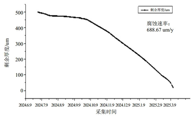 為進(jìn)一步確定實(shí)際腐蝕情況,于2024年7月1日在鹽堿地現場(chǎng)埋設ER腐蝕速率探頭,至2025年3月13日,8個(gè)多月探頭壁厚由最初的499.06μm減薄至19.75μm,陰極保護管理平臺根據壁厚減薄自動(dòng)折算的腐蝕速率為0.688 mm/y(圖 6),與實(shí)驗室采用失重法計算的0.578 mm/y相差0.110 mm/y,誤差為15.9%?紤]到現場(chǎng)實(shí)際的鹽堿地土壤環(huán)境,經(jīng)歷了大自然春夏秋冬和干濕交替,與實(shí)驗室的鹽堿地土樣條件及成分可能不完全一致,由此會(huì )呈現腐蝕速率偏差。但探頭壁厚減薄與試片失重兩者均表明鹽堿地對金屬的腐蝕性較強,若埋地金屬管道沒(méi)有采取合理的防護措施,以大于0.5 mm/y的腐蝕速率計,在管道的設計壽命內,鹽堿地土壤會(huì )大大加速管道腐蝕泄漏風(fēng)險。