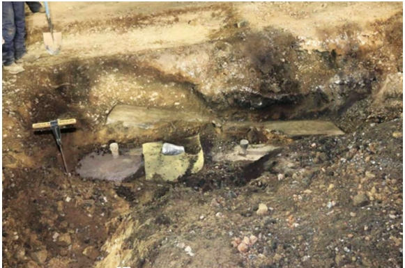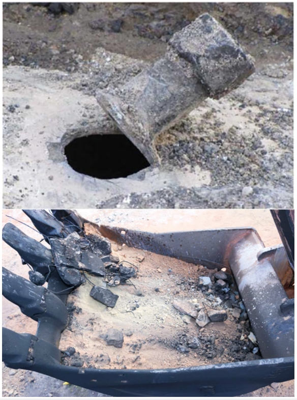 (2)混凝土蓋板未起到保護作用。事后發(fā)現,TOR配件上方安置了兩塊混凝土蓋板,每塊蓋板長(cháng)1.2 m、寬0.9 m,用于保護管道免遭破壞。而事故發(fā)生時(shí),施工方并不掌握混凝土蓋板的尺寸、深度或位置,現場(chǎng)人員手中的圖紙也未標識出TOR配件上方的蓋板,且僅標識了兩個(gè)TOR配件。實(shí)際開(kāi)挖過(guò)程中,蓋板埋深大致為0.5 m,受到了挖掘機的直接沖擊,致使蓋板損壞,未能起到保護作用(圖 4)。